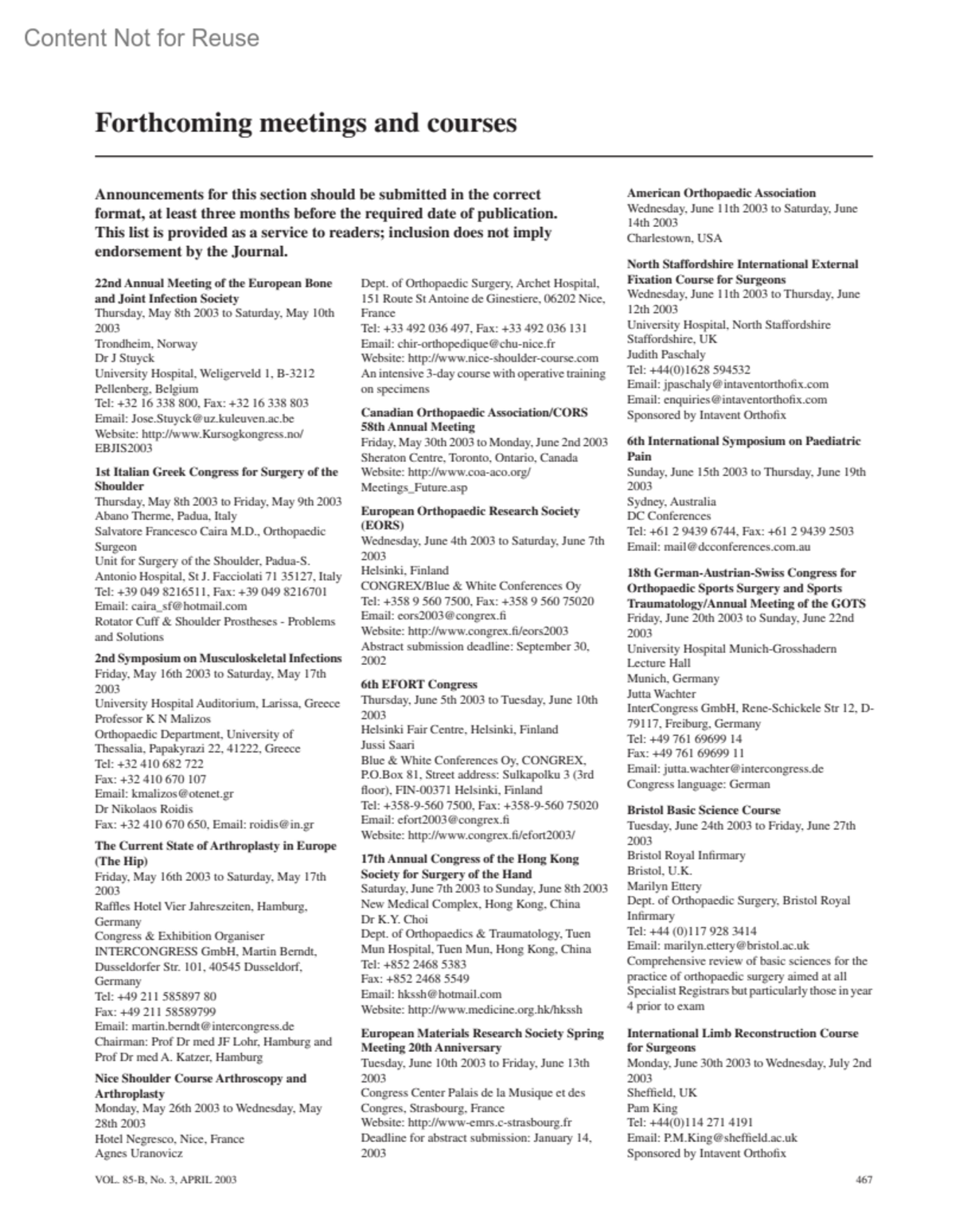 Forthcoming meetings and coursesJournal of Bone and Joint Surgery, British Volume 85-B(3):p 467-468, April 2003.Copyright © 2003 British Editorial Society of Bone and Joint Surgery