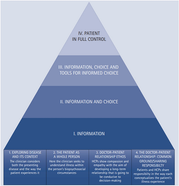 To guide how to achieve true PCC in dentistry, a hierarchy of information and choice was added to the model proposed by Scambler and Asimakopoulou. The hierarchy has the foundations of PCC at the bottom, which was outlined previously. On top of the foundational components of PCC are four levels: (i) information, (ii) information and choice, (iii) information, choice and tools for informed choice and (iv) patient in full control. The hierarchy suggests that clinical consultations are more patient-centred the higher they sit in the pyramid.