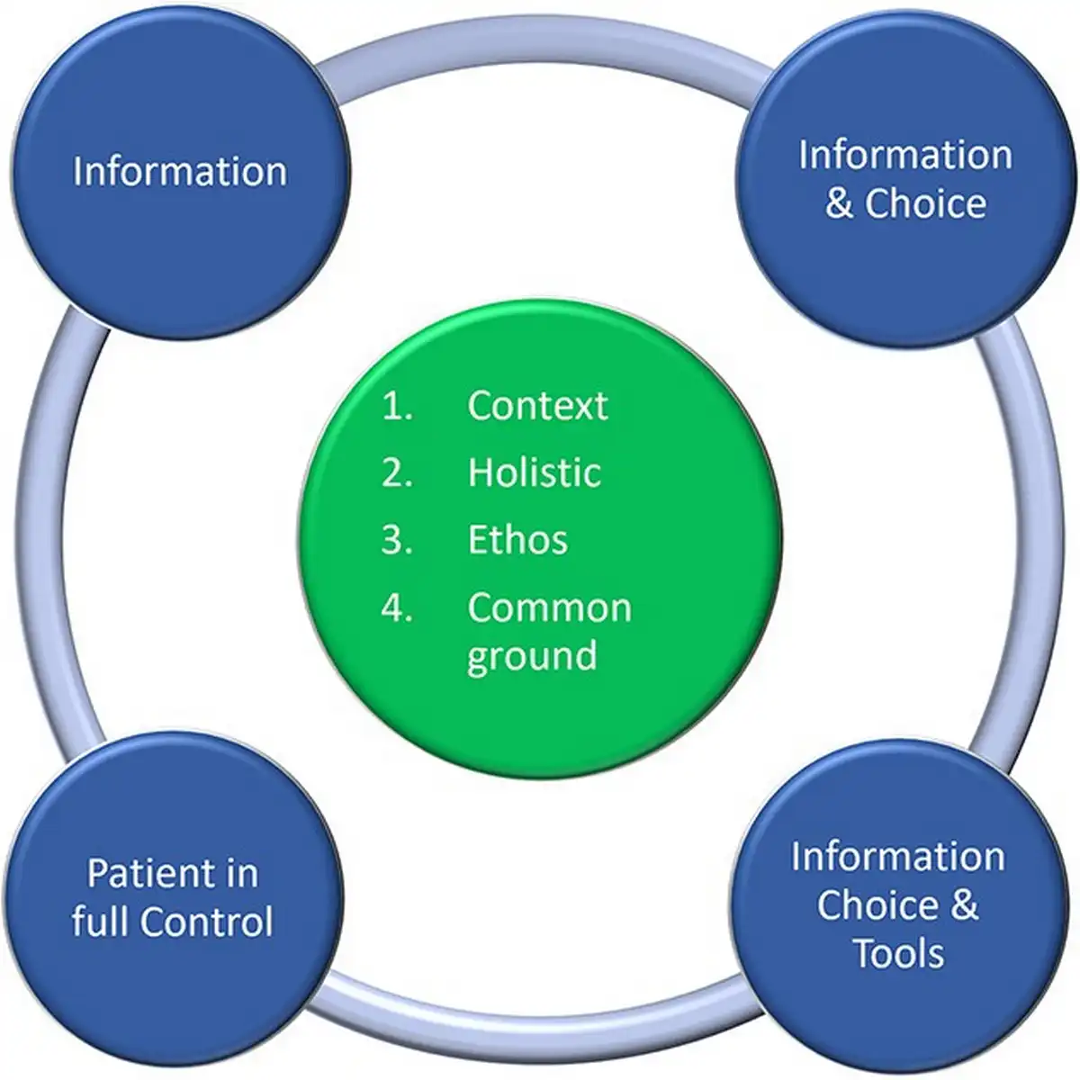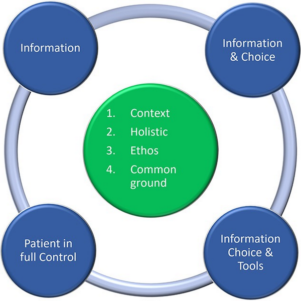 In summary, this paper identified a model of PCC tailored for dentistry. While this model is theory-derived, it is important to consider its utilization in light of the following limitations. For example, it may be that PCC is wider than information and choice as suggested in the model. Furthermore, reducing the model to information and choice may make the model more implementable, however, it may miss important aspects of PCC and thus, be less representative of true PCC. Moreover, the hierarchical structure of the model suggests that a higher level is better than a lower level. However, higher levels within the hierarchy are only better if the patient wants to be involved. The model could be reconceptualized into a circle instead to reflect different aspects of PCC, rather than levels (Fig. 2).