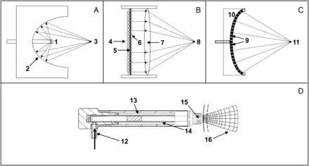 Schematic representation of the mode of operation of focused (A–C) and radial (D) extracorporeal shock wave generators. (A) Electrohydraulic principle (fESWT): a high voltage discharges rapidly across two electrode tips (spark-gap) (1) that are positioned in water. The spark-gap serves as the first focal point (1). The heat generated by this process vaporizes the surrounding water. This generates a gas bubble centered on the first focal point, with the gas bubble being filled with water vapor and plasma. The result of the very rapid expansion of this bubble is a sonic pulse, and the subsequent implosion of this bubble causes a reverse pulse, manifesting a shock wave. By means of reflectors of certain shape (2), this shock wave can be converted into a convergent/focused acoustic pressure wave/shock wave with a point of highest pressure at the second focal point (3). (B) Electromagnetic principle (fESWT): a strong, variable magnetic field is generated by passing a high electric current through a coil (4). This causes a high current in an opposed metal membrane (5), which causes an adjacent membrane (6) with surrounding liquid to be forced rapidly away. Because the adjacent membrane is highly conductive, it is forced away so rapidly that the compression of the surrounding liquid generates a shock wave within the liquid. By means of an acoustic lens (7) of certain shape, this shock wave can be converted into a convergent/focused acoustic pressure wave/shock wave with a point of highest pressure at a focal point (8). (C) Piezoelectric principle (fESWT): a large number of piezocrystals (9) are mounted in a bowl-shaped device (10); the number of piezocrystals can vary from a few to several thousands (typically between 1000 and 2000). When applying a rapid electrical discharge, the piezocrystals react with a deformation (contraction and expansion), which is known as the piezoelectric effect. This induces an acoustic pressure puls in the surrounding water that can steep into a shock wave. Because of the design of the bowl-shaped device an acoustic pressure wave/shock wave can emerge with a point of highest pressure at a focal point (11). (D) Ballistic principle (rESWT): compressed air (pneumatic principle; 12) or a magnetic field (not shown) is used to fire a projectile (13) within a guiding tube (14) that strikes a metal applicator (15) placed on the patient's skin. The projectile generates stress waves in the applicator that transmit pressure waves into tissue (16).