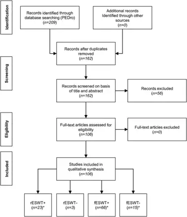 The outcome of the first search is shown in Figure 3. We identified n = 209 records in the PEDro database of which n = 47 were duplicates. All reviews (n = 48) were excluded, as well as records that did not address ESWT (n = 3).– Furthermore, all ESWT studies on wound healing and chronic decubitus were excluded (n = 5).– The remaining records (n = 106) were divided into studies on (i) radial ESWT with positive outcome (i.e. radial ESWT significantly better statistically than either placebo or alternative treatment modalities) (rESWT+; n = 23), (ii) radial ESWT with negative outcome (i.e. radial ESWT not significantly better statistically than either placebo or alternative treatment modalities) (rESWT−; n = 3), (iii) focused ESWT with positive outcome (fESWT+; n = 66) and (iv) focused ESWT with negative outcome (fESWT−; n = 15) (note that one RCT addressed both radial and focused ESWT and, thus, was listed in both groups rESWT+ and fESWT+).