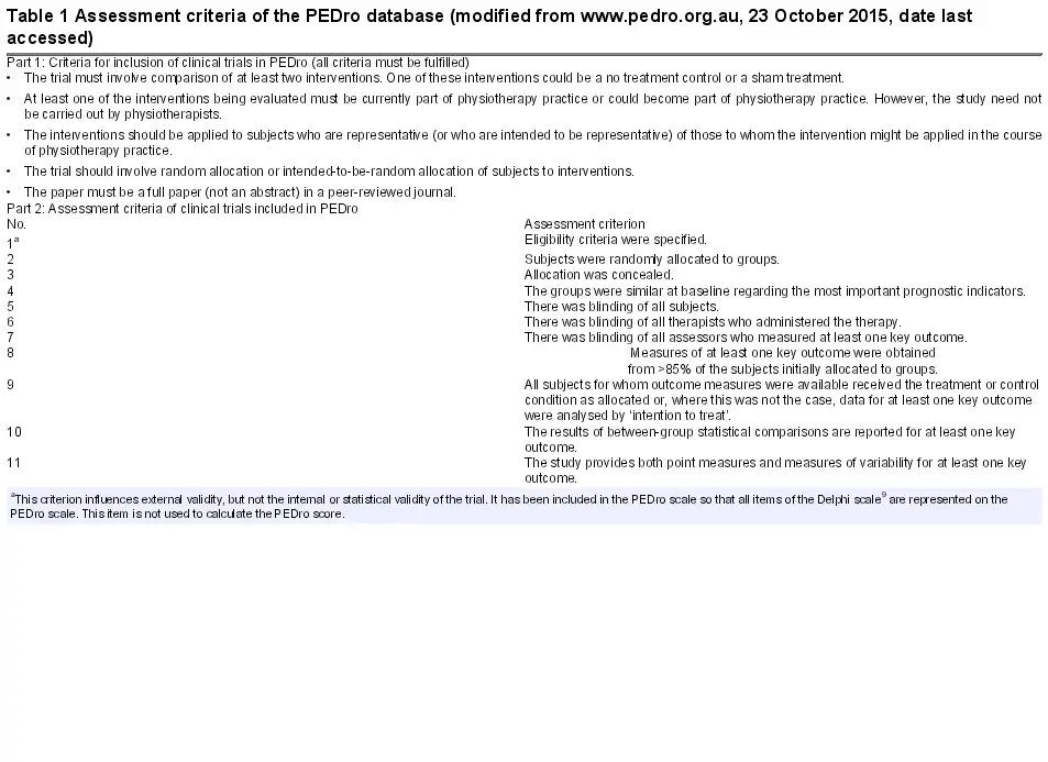 The PEDro database (www.pedro.org.au, 23 October 2015, date last accessed) is a freely available database of over 31 000 randomized controlled trials (RCTs), systematic reviews and clinical practice guidelines in physical and rehabilitation medicine. For each RCT, review or guideline, the PEDro database provides the citation details, the abstract and a link to the full text, where possible. All RCTs listed in the PEDro database (henceforth referred to as ‘RCTs in PEDro’) are independently assessed for quality (the assessment criteria are summarized in Table 1). All but two of the PEDro scale items are based on the Delphi list. PEDro is currently the largest independent database on topics related to physical and rehabilitation medicine and is often used by investigators in Norway, Australia and New Zealand; less so by other European and North American investigators.