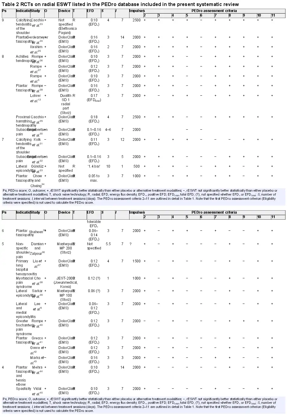 The reliability of the PEDro scale for rating the quality of RCTs was demonstrated and subsequently confirmed independently. Using RCTs derived only from the PEDro database, we sought to (i) clarify some common misconceptions regarding ESWT and (ii) for specific indications, compare ESWT with other forms of non-operative treatment.
