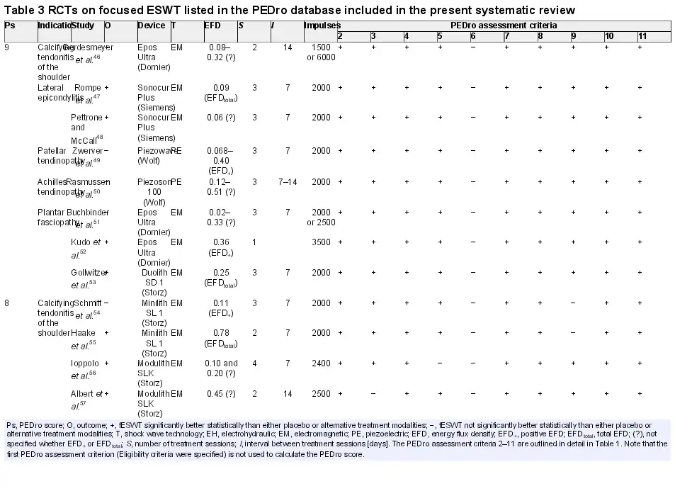 Third, because of the first and second limitations, all conclusions of the present study are only valid for those shock wave generators that were used in the RCTs on ESWT in PEDro (Tables 2 and 3). This is particularly important considering the substantial variability in treatment success and rates of unwanted side effects found when treating the same clinical condition (lateral epicondylitis) with different electromagnetic and piezoelectric fESWT devices operated at comparable energy settings.,
