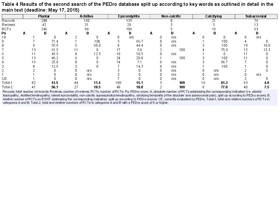 For plantar fasciopathy, 41.5% of the RCTs listed in the PEDro database were RCTs on ESWT (56.1% of the RCTs with PEDro score ≥6). For other indications, the corresponding relative numbers of RCTs on ESWT were as follows: Achilles tendinopathy: 11.4% of all RCTs, and 18.5% of those RCTs with PEDro score ≥6. Lateral epicondylitis: 15.1% of all RCTs, and 18.8% of those RCTs with PEDro score ≥6. Non-calcific supraspinatus tendinopathy: 100% of all RCTs. Calcifying tendonitis of the shoulder: 81.3% of all RCTs, and 77.8% of those RCTs with PEDro score ≥6. Subacromial pain syndrome: 4.8% of all RCTs, and 7.5% of those RCTs with PEDro score ≥6.