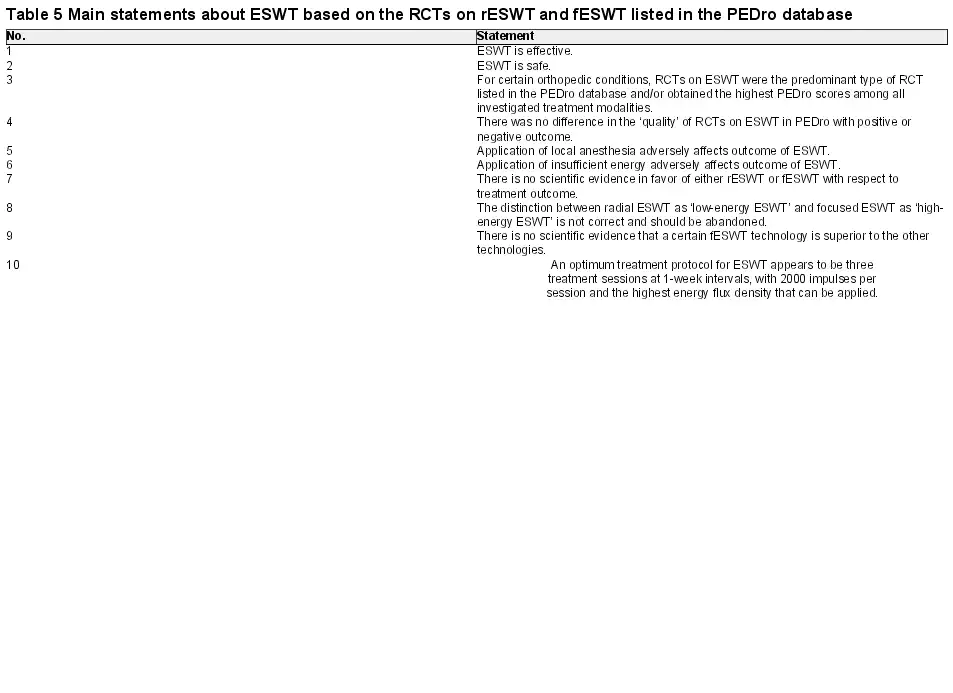 We have derived 10 main statements about ESWT based on the RCTs on rESWT and fESWT in PEDro (Table 5). Each statement is briefly substantiated by scientific evidence developed in the present systematic review. References to studies not listed in PEDro were kept at the absolute minimum and marked by an asterisk.
