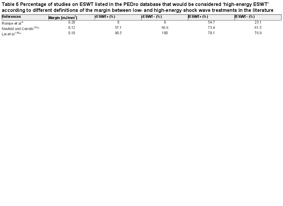 Rompe et al. arbitrarily defined an EFD of 0.2 mJ/mm2 as the margin between low- and high-energy shock wave treatments. Following this definition, 100% of the RCTs on rESWT, ∼45% of the fESWT+ RCTs and ∼77% of the fESWT− RCTs in PEDro were performed with low-energy shock waves (c.f. Tables 2 and 3). However, other definitions of the margin between low- and high-energy shock wave treatments were published*,* (Table 6). Accordingly, it is not correct to characterize rESWT as low-energy shock wave treatment and fESWT as high-energy shock wave treatment, as different authors have used different thresholds for this distinction. Because there is no consensus in the literature about the difference between low- and high-energy ESWT, this distinction appears arbitrary and should be abandoned.