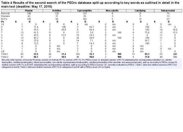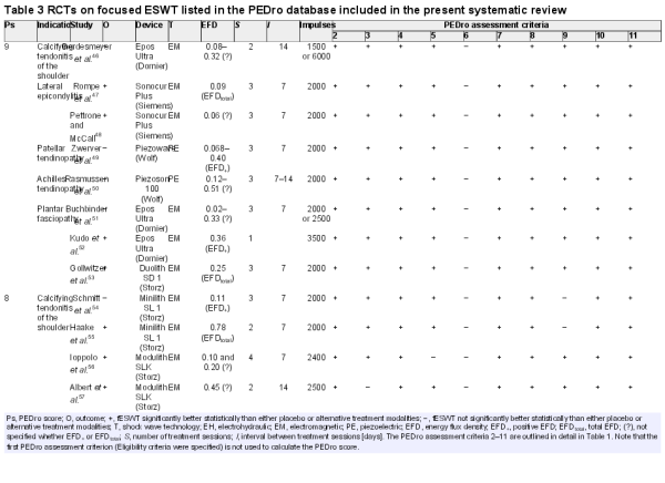There are three main limitations inherent to the present systematic review on ESWT. First, with few exceptions, only RCTs on ESWT in PEDro were considered. This approach was adopted to minimize selection bias by using the selection process and criteria of an independent third party that has never been involved in planning, performing and funding any study on ESWT, and to rely on the proven reliability of the PEDro scale for rating the quality of RCTs. Accordingly, all analyses, interpretations and conclusions of the present study are only valid for those RCTs on ESWT in PEDro.