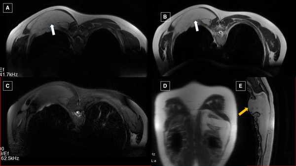 Axial T1WI (A) and T2WI (B) showing hyperintense lesion (marked by white arrow) in the left paravertebral region extending from D5 to D12 levels, which is suppressed on fat suppressed sequence, that is, stir (C). Corresponding coronal (D) and sagittal (E) T2WI showing the extent of the lesion. Protrusion of lipoma causing intercostal widening is marked by yellow arrow (WI—weighted image, STIR—short τ inversion recovery sequence).