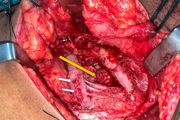 Intraoperative photograph showing adhesions to periosteum of rib (marked by multiple white arrows) and widening of intercostal space (marked by yellow arrow) after removal of the lipomatous mass.