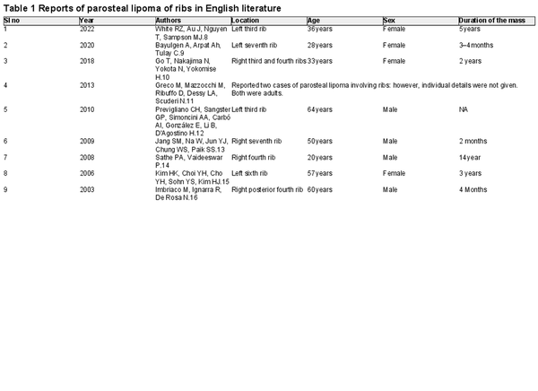 We reviewed the English literature through PubMed search and found only nine studies describing parosteal lipoma affecting the ribs in 10 patients (table 1). All were adults (ranging from 20 years to 64 years) except in one case, where the lesion was present since childhood and slowly increasing in size. Males and females were affected equally with duration of the mass ranging from 2 months to 14 years. Additionally, both side ribs were affected equally with the third and fourth ribs being more commonly affected. Surgical excision was curative in all cases without any recurrence. Ours is the first case of parosteal lipoma of ribs to be reported in a child that was managed successfully with surgical excision.