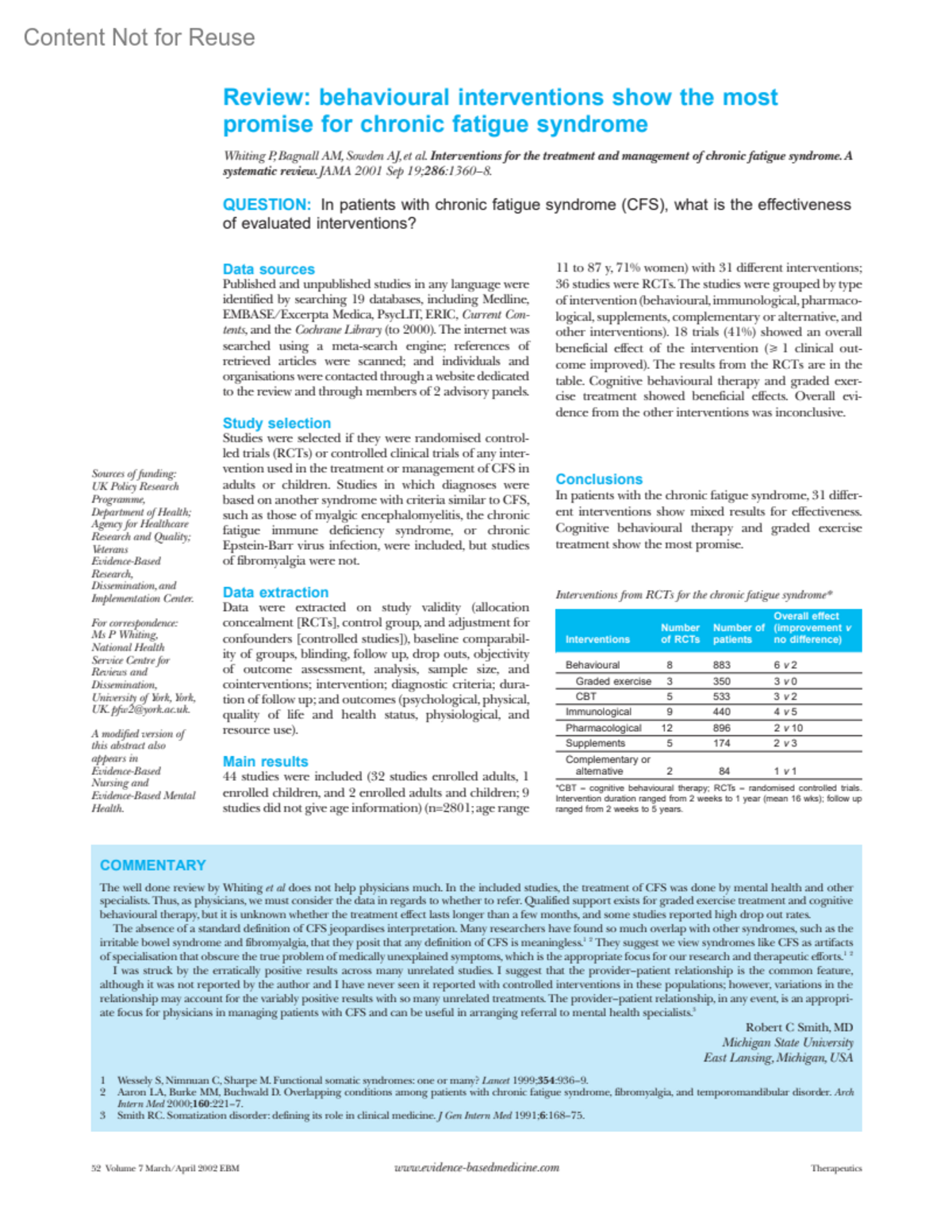 Whiting P, Bagnall AM, Sowden AJ, et al. Interventions for the treatment and management of chronic fatigue syndrome. A systematic review. JAMA 2001 Sep 19;286:1360–8