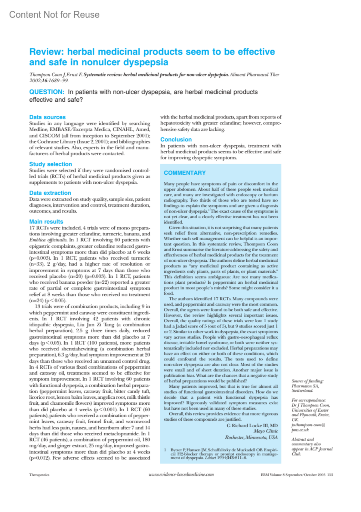 Review: herbal medicinal products seem to be effective and safe in nonulcer dyspepsiaSystematic review: herbal medicinal products for non-ulcer dyspepsia.