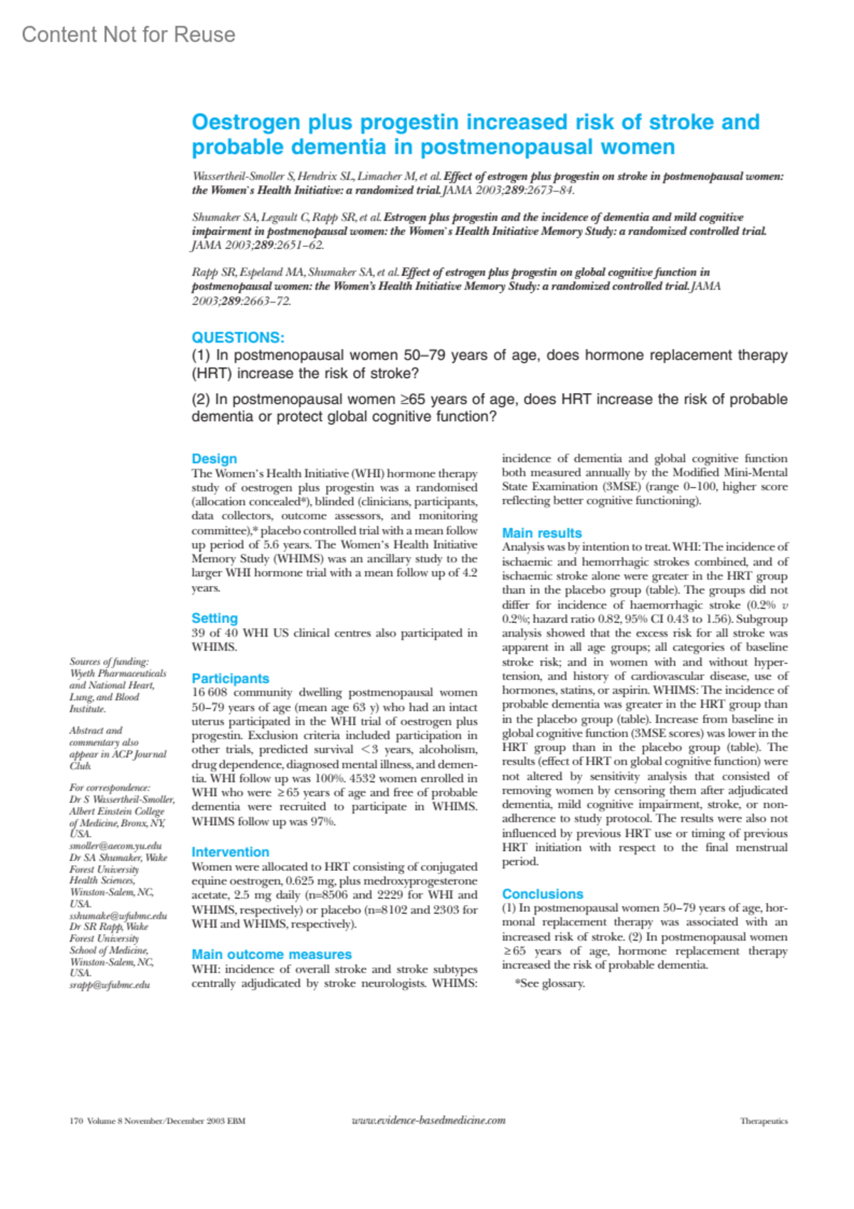 Wassertheil-Smoller S, Hendrix SL, Limacher M, et al.Effect of estrogen plus progestin on stroke in postmenopausal women: the Women’s Health Initiative: a randomized trial.JAMA 2003;289:2673–84.Wassertheil-SmollerSHendrixSLLimacherMet alEffect of estrogen plus progestin on stroke in postmenopausal women: the Womens Health Initiative: a randomized trial.JAMA20032892673-84Shumaker SA, Legault C, Rapp SR, et al.Estrogen plus progestin and the incidence of dementia and mild cognitive impairment in postmenopausal women: the Women’s Health Initiative Memory Study: a randomized controlled trial.JAMA 2003;289:2651–62.ShumakerSALegaultCRappSRet alEstrogen plus progestin and the incidence of dementia and mild cognitive impairment in postmenopausal women: the Womens Health Initiative Memory Study: a randomized controlled trial.JAMA20032892651-62Rapp SR, Espeland MA, Shumaker SA, et al.Effect of estrogen plus progestin on global cognitive function in postmenopausal women: the Women’s Health Initiative Memory Study: a randomized controlled trial.JAMA 2003;289:2663–72.RappSREspelandMAShumakerSAet alEffect of estrogen plus progestin on global cognitive function in postmenopausal women: the Womens Health Initiative Memory Study: a randomized controlled trial.JAMA20032892663-72