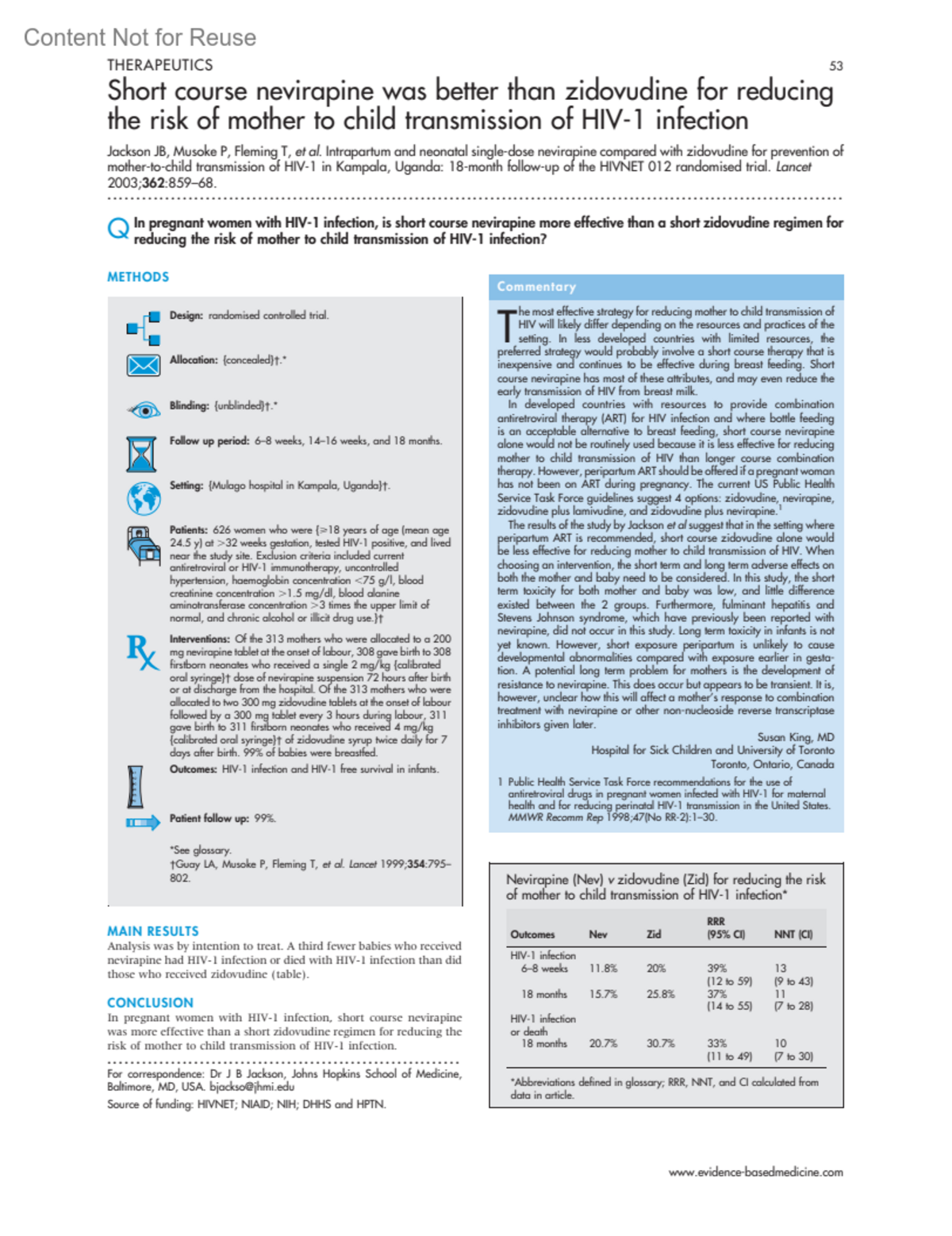 Short course nevirapine was better than zidovudine for reducing the risk of mother to child transmission of HIV-1 infectionIntrapartum and neonatal single-dose nevirapine compared with zidovudine for prevention of mother-to-child transmission of HIV-1 in Kampala, Uganda: 18-month follow-up of the HIVNET 012 randomised trial.