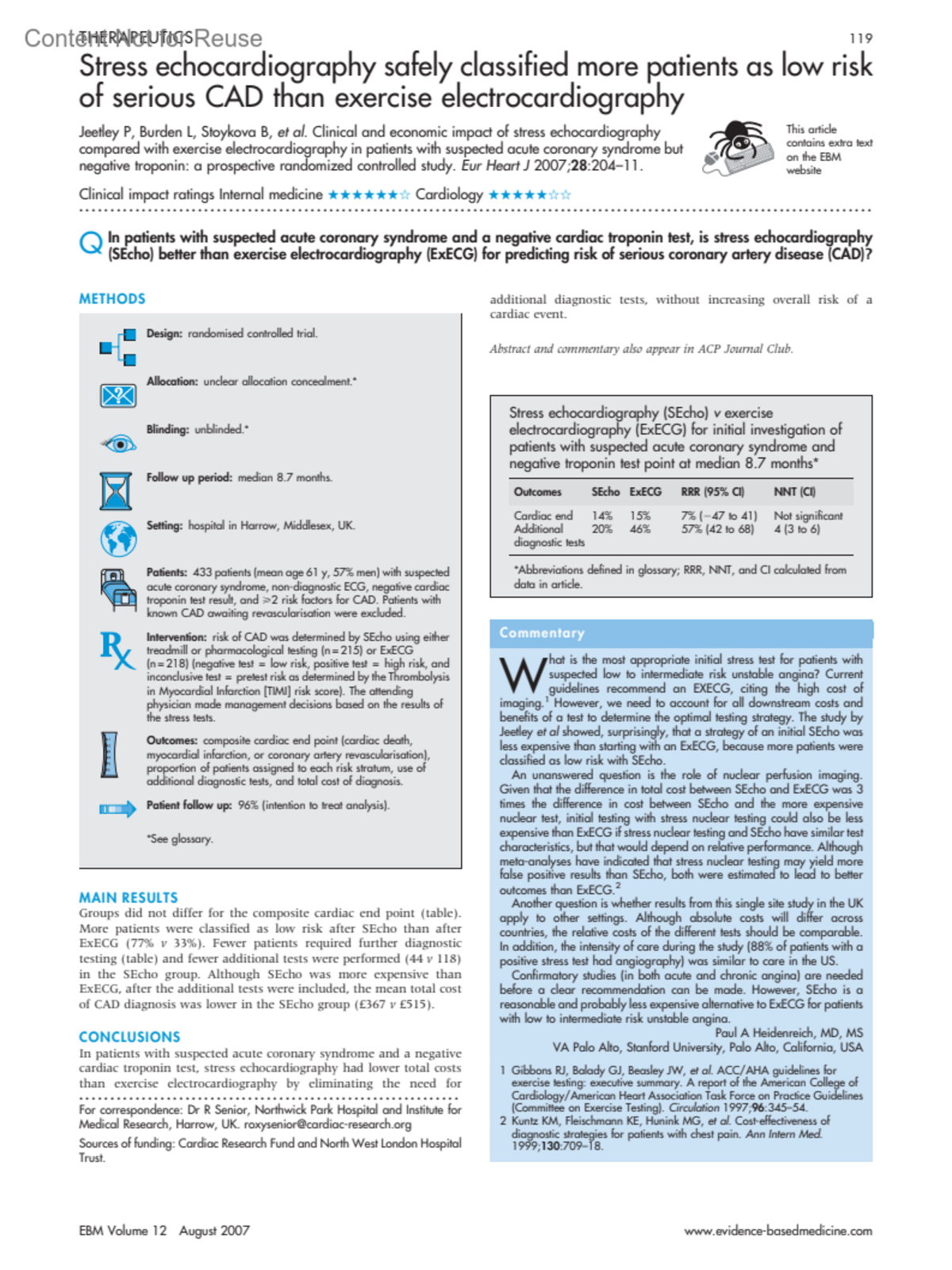 Stress echocardiography safely classified more patients as low risk of serious CAD than exercise electrocardiographyClinical and economic impact of stress echocardiography compared with exercise electrocardiography in patients with suspected acute coronary syndrome but negative troponin: a prospective randomized controlled study.
