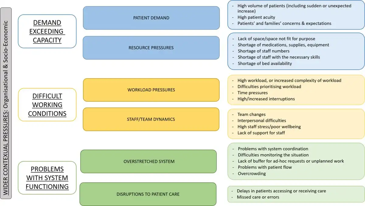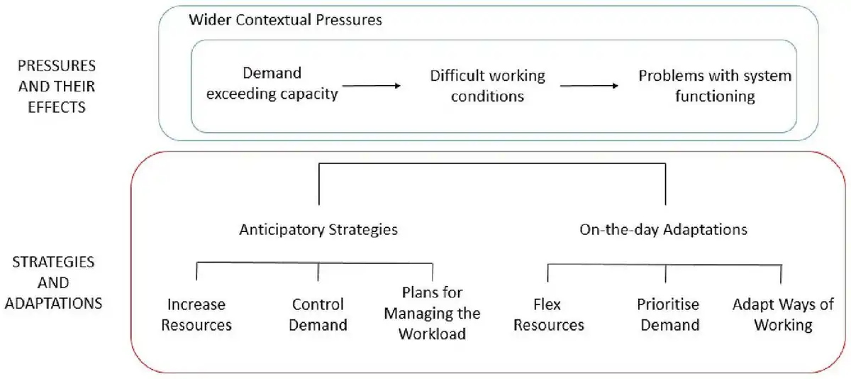Healthcare systems are operating under substantial pressures and will do so for the foreseeable future. Growing pressures include an ageing population, increased comorbidities and presence of long-term health conditions, and increasingly high standard of care expected by society, government, patients and professionals. The capacity of healthcare systems is limited, and many are experiencing substantial financial pressures and staff shortages, which have been further exacerbated by the COVID-19 pandemic. Healthcare institutions have to try and balance the demand for care with the available resources. For example, emergency services often experience shifts where the number of patients and associated treatment needs exceed the available staff, equipment or physical space. Services, teams and individual professionals are constantly adapting in times of increased pressure, with adaptations made to staff allocation, patient flow and the functioning of services. The principal aim of these adaptations is to minimise the risks to patients and to maintain a reasonable quality and safety of care within the available constraints.