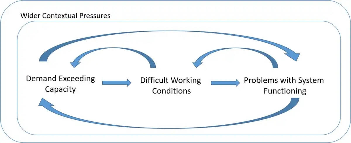 An imbalance between system capacity and patient demand coupled with increasingly difficult working conditions can lead to a decline in broader system functioning. Several studies referred to problems with co-ordination and communication across the system, making it difficult to monitor resource availability or manage changing priorities along the patient journey. Other system pressures included a reduced buffer capacity for responding to ad hoc requests or sudden increase in demand. Many studies cited pressures relating to patient flow, whether that was a difficulty in discharging patients or bottlenecks within the hospital, as well as problems with overcrowding particularly in the emergency department. Delays in patients accessing or receiving care as well as missed care or errors were additional problems which further increased the workload and patient demand.