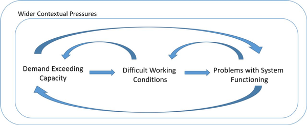 There were contextual pressures described in the studies that were external to the clinical teams concerned and pressures experienced within organisations which were almost exclusively due to the demand for care exceeding the resources available. These two sources of pressures had consequences for the working conditions for staff and for wider system functioning. For clarity, we describe four separate categories of pressures and their knock-on effects on clinical work, though in practice they relate to fluid and dynamic ways as we discuss at the end of this section. These are (1) contextual pressures, (2) demand exceeding capacity, (3) difficult working conditions and (4) problems with system functioning. Figure 1 shows the taxonomy of pressures and their effects on clinical work and figure 2 shows how they interrelate. Specific examples for the different categories of pressures are available in online supplemental file 4.SP410.1136/bmjqs-2023-016686.supp4