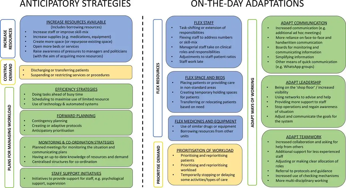 A taxonomy of course can never capture the very complex and evolving patterns of care in a clinical environment under pressure. While we believe that developing a taxonomy is a necessary step to further study and evaluate the adaptive strategies, we are aware that a taxonomy alone does not capture the phenomenon of adaptive capacity and that successful adaptation requires much more than simply a knowledge of adaptive strategies. First, the actions of individual clinicians will be either supported or constrained by the wider capacity of the system to anticipate, monitor, respond and learn. Second, there may well be trade-offs between short-term and long-term adaptive capacity, in that successful adaptation on the day can have the effect of reducing capacity to meet future threats. Third, adaptive capacity is a finite resource and dependent to some extent on having some spare capacity in a system, in the sense of staff, skills and resources that can be drawn on to meet increased demand. In order to put some adaptive strategies into practice, there needs to be ‘slack’ or ‘margins’ in the system, as well as access to additional resources. A system that prioritises productivity above all else will eventually degrade its capacity to adapt.