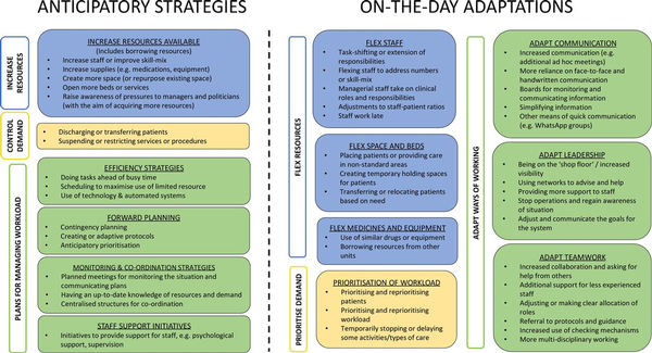 We found that anticipatory strategies could be broadly grouped into those aimed at managing capacity and demand and those which were aimed at making plans to manage the workload in anticipation of forthcoming pressures. Figure 3 shows a full taxonomy of strategies. For more detailed examples, see online supplemental file 4.