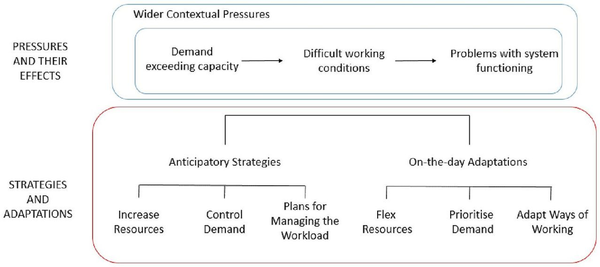After extracting all the pressures and strategies from the included papers, we set out to develop a taxonomy of pressures and strategies. After successive iterations, described above, we established four broad classes of pressures and knock-on effects for clinical work that precipitated adaptations. We identified two broad classes of adaptive strategies, anticipatory strategies to prepare for pressures and those used on-the-day to manage immediate pressures.