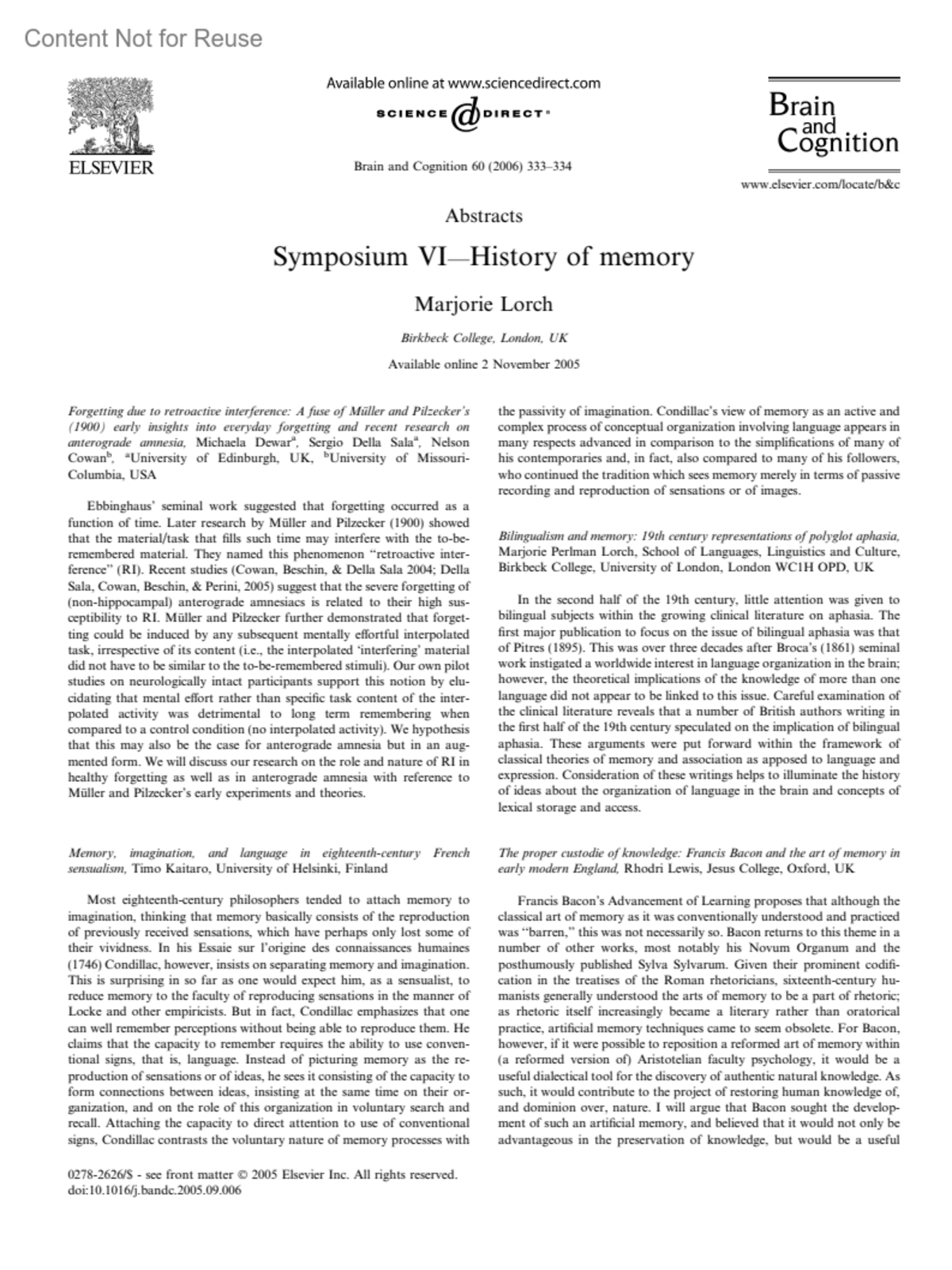 Memory, imagination, and language in eighteenth-century French sensualismKaitaro, TimoAuthor informationUniversity of Helsinki, FinlandBrain and Cognition 60(3):p 333, April 2006.Copyright © 2006Elsevier, Inc.