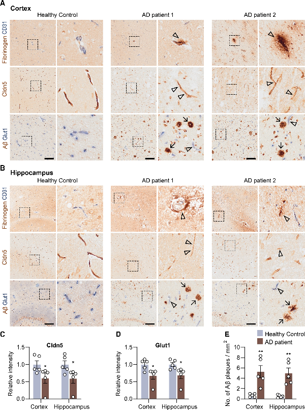 BBB dysfunction and BEC disruption in post-mortem Alzheimer’s disease brains. (A) Fibrinogen/CD31, Cldn5 and Aβ/Glut1 staining in the cortex and (B) hippocampus of post-mortem health control and patients with Alzheimer’s disease. (C) Quantification of Cldn5 and (D) Glut1 intensity, and (E) Aβ plaques in the cortex and hippocampus of healthy controls and patients with Alzheimer’s disease. Black frames in the low-magnification images indicate the location of the high-magnification images to the right. Arrows indicate Aβ plaques, and arrowheads indicate the fibrinogen leakage and decreased Cldn5 and Glut1 in patients with Alzheimer’s disease. Scale bar = 200 µm in A and B. Data are presented as mean ± SEM, n = 5, *P < 0.05, **P < 0.01.