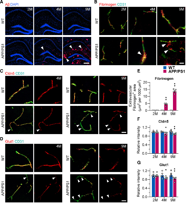 To determine whether BBB malfunction is associated with impaired BECs, we evaluated expression of tight junction protein Claudin-5 and glucose transporter Glut-1 both being essential for maintaining BEC integrity and function. We found that expression of Claudin-5 and Glut-1 were significantly decreased in APP/PS1 mice at 4 and 9 months compared to age-matched wild-type mice (both markers P < 0.05 and P < 0.01, respectively, Fig. 2C, D, F and G), consistent with fibrinogen leakage.