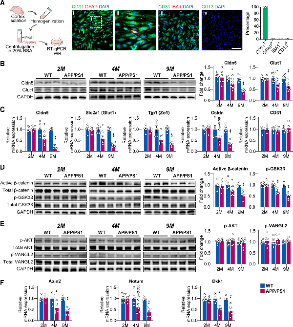 Decreased Wnt/β-catenin pathway in cerebral microvessels of APP/PS1 mice. (A) Schematic diagram of cerebral microvessels isolation. Representative immunostaining images of markers for (i and ii) endothelium (CD31), astrocyte (GFAP), (iii) microglia (IBA1) and (iv) pericyte (CD13) (scale bar = 100 µm). (B) Protein levels of Cldn5 and Glut1 in isolated cerebral microvessels of 2-, 4- and 9-month-old wild-type (WT) and APP/PS1 mice. (C) mRNA expression of Cldn5, Zo-1, Glut1, Ocldn and CD31 in microvessels from 2-, 4- and 9-month-old wild-type and APP/PS1 mice. (D) Protein levels of active β-catenin and phosphorylated Ser9-GSK3β in microvessels form 2-, 4- and 9-month-old wild-type and APP/PS1 mice. (E) Protein levels of AKT and Vangl2 in microvessels of 2-, 4- and 9-month-old wild-type and APP/PS1 mice. (F) mRNA expression of canonical Wnt pathway targets Axin2, Notum and DKK1 in microvessels of 2-, 4- and 9-month-old wild-type and APP/PS1 mice. Data are presented mean ± SEM, n = 6 in the 2- and 9-month group, n = 8 in the 4-month group for the western blot experiment; n = 5 for the RT–qPCR experiment; *P < 0.05, **P < 0.01.