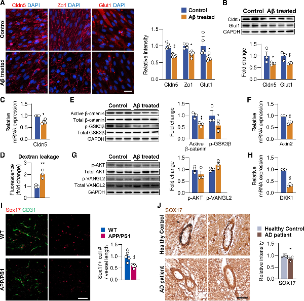 Aβ oligomer treatment induces BEC disruption and downregulates Wnt/β-catenin signalling elements. (A) Immunostaining and quantification of Cldn5, Zo-1 and Glut1 in control and Aβ treated BECs (scale bar = 20 µm). (B) Protein levels of Cldn5 and Glut1, (C) mRNA expression of Cldn5, (D) in vitro trans-well permeability assay, (E) protein levels of active β-catenin and phosphorylated Ser9-GSK3β, (F) mRNA expression of Axin2, (G) protein levels of AKT and Vangl2 and (H) mRNA expression of DKK1 in control and Aβ treated BECs. (I) Immunostaining and quantification of Sox17 in 4-month-old wild-type (WT) and APP/PS1 mice (scale bar = 50 µm). (J) Sox17 levels in the cortex of health control and patients with Alzheimer’s disease (scale bar = 50 µm). Data are presented as mean ± SEM, n = 3 in (B–H), n = 5 in (A, I and J), *P < 0.05, **P < 0.01.