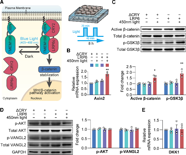 Optogenetic activation of Wnt/β-catenin pathway. (A) Schematic diagram of the optogenetic method. (B) Axin2 mRNA expression, (C) protein levels of active β-catenin and phosphorylated Ser9-GSK3β, (D) protein level of AKT and Vangl2 and (E) DKK1 mRNA expression in the BECs. Data are presented as mean ± SEM, n = 3, *P < 0.05, **P < 0.01.
