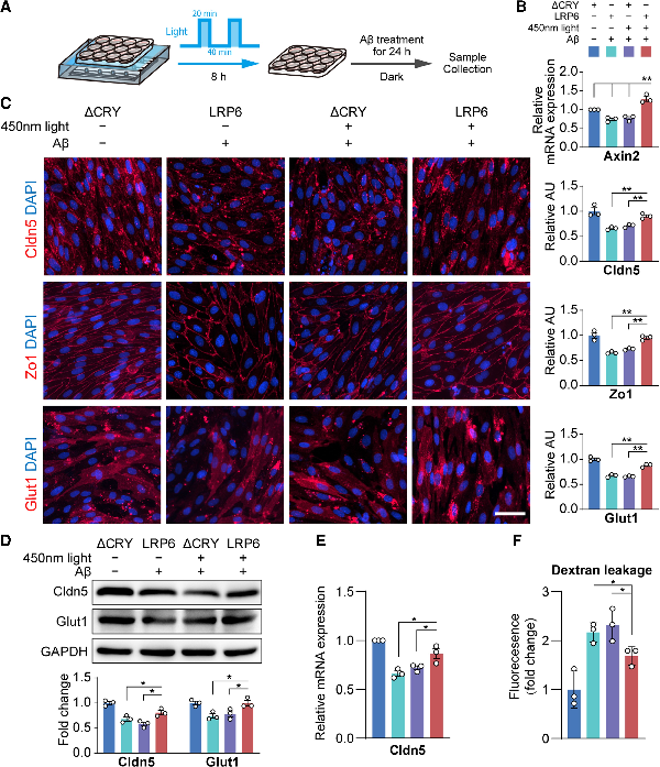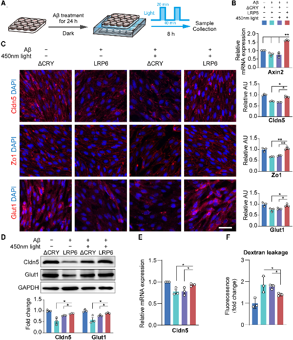 Activation of the Wnt/β-catenin pathway by OptoLRP6 prevents Aβ oligomer-induced BEC disruption. (A) Schematic diagram of experiment design. (B) Axin2 mRNA expression, (C) immunostaining and quantification of Cldn5, Zo-1 and Glut1 (scale bar = 20 µm), (D) protein levels of Cldn5 and Glut1, (E) Cldn5 mRNA expression and (F) in vitro trans-well permeability assay in BECs. Data are presented as mean ± SEM, n = 3, *P < 0.05, **P < 0.01.