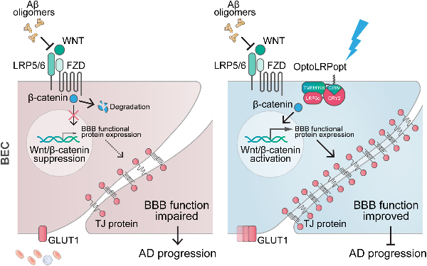 Targeting LRP6 in the Wnt/β-catenin pathway in BECs alleviates BBB dysfunction. In the Alzheimer’s disease (AD) brain, Aβ oligomers suppress Wnt/β-catenin signalling in the BECs, leading to reduced expression of endothelial functional proteins and BBB malfunction. Our recently developed optogenetic tool allows precise regulation of LRP6, the upstream regulator of Wnt/β-catenin signalling. The activation of Wnt/β-catenin signalling restored Aβ-inhibited BEC function by reversing and preventing Aβ-induced BEC pathological changes.