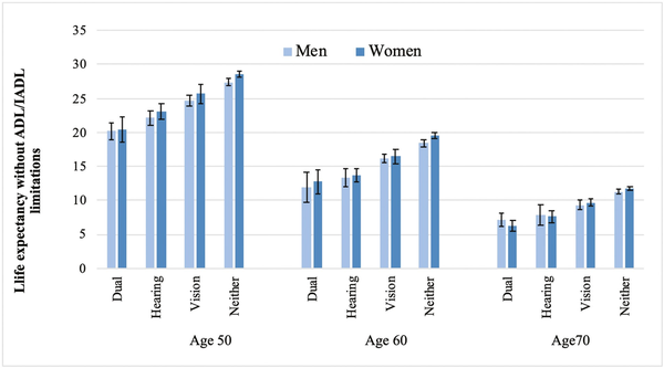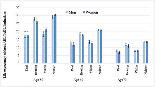 Estimates of life expectancy without activities of daily living (ADL)/instrumental activities of daily living (IADL) limitations (in years) according to vision and hearing difficulties, by gender and age, United States 2002–2013. Estimates from models with covariates age, sex, and wealth and interaction term between age and vision and hearing difficulties.