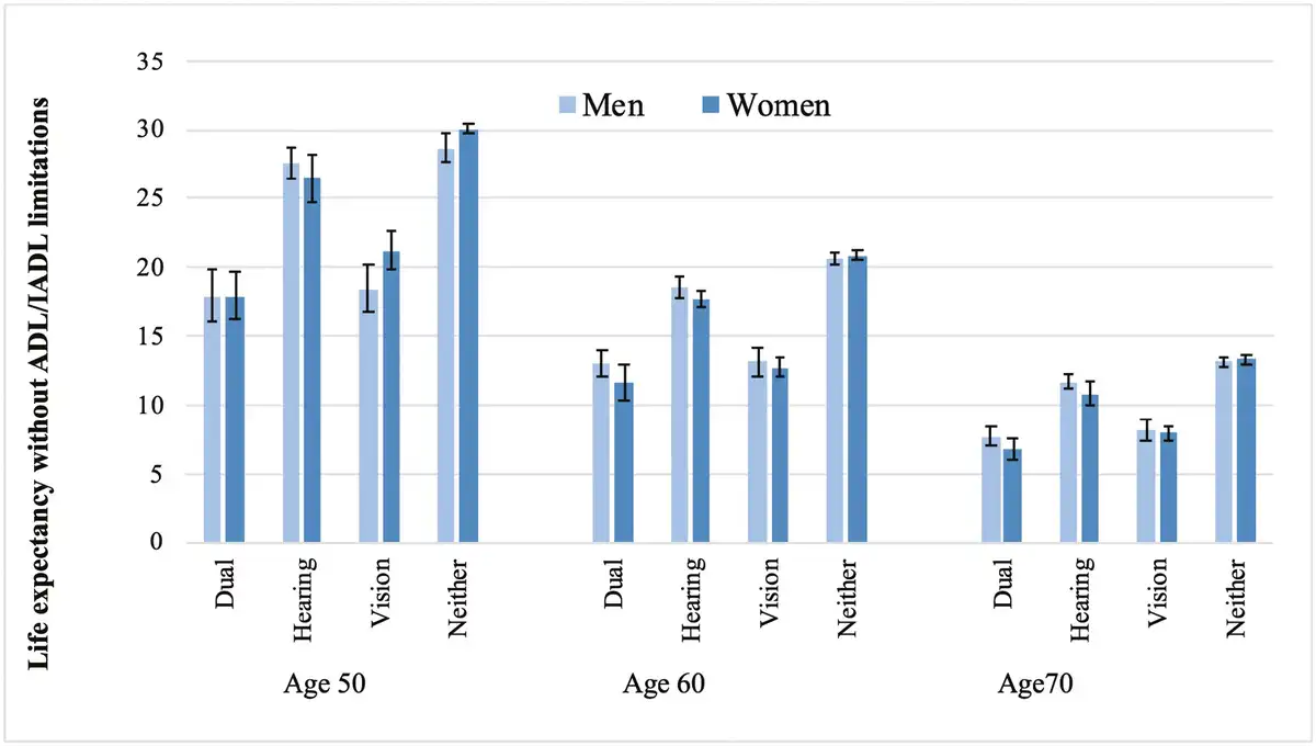 Our findings, from 2 large nationally representative studies of aging in the United States and England, showed that self-reported single (hearing or vision only) and dual (both hearing and vision) difficulties in older adults were associated with shorter life expectancy as well as shorter life expectancy without ADL/IADL limitations. Similarly, people with vision, hearing, or dual sensory difficulties live more years with ADL/IADL limitations than those with no difficulties. The association is greater among those with dual sensory difficulty in both countries. The gap in the years expected to live without ADL/IADL limitations between those reporting no difficulties and those reporting dual sensory difficulty was as large as 12 years. This finding is supported by a study using data from the Panel on Health and Ageing of Singaporean Elderly, which found that older adults with dual sensory difficulty had fewer years without limitation in physical function and in ADLs than those without difficulty (). Individuals with single sensory difficulty (hearing or vision only) are more likely to use the other normally functioning sensory to compensate for their impairment (). The concurrent vision and hearing difficulties may remove those compensatory mechanisms and lead to greater dependence. For instance, poorer vision will limit individuals with hearing impairment from seeing the sign language interpreter. A qualitative study identified that, in addition to difficulties with communication, individuals with dual sensory difficulty found it challenging to navigate unfamiliar surroundings, leading to a loss of independence ().