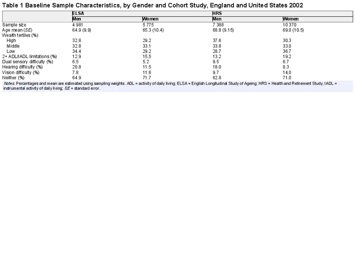 The characteristics of the study cohorts at baseline (2002) are presented in Table 1. The average age of men and women in England was 65 and that of men and women in the United States was 69. The prevalence of disability was 13% among men in both England and the United States, although it was higher among women (16% in England and 19% in the United States).