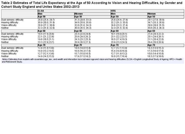In conclusion, our study found that, among adults aged 50 and older living in England and the United States, sensory difficulty is associated with both reduced life expectancy and life expectancy without ADL/IADL limitations, and the impact is greater among those with dual sensory difficulty. It implies that sensory difficulty should not be considered a normal aspect of the aging process. Despite being highly prevalent, age-related vision and hearing difficulties are often underreported, and their impact is poorly recognized (,), which may explain the low rates of interventions to improve the conditions, including hearing aid use (). This study thus highlights the need for greater recognition by health policy-makers of the importance of sensory difficulty as a public health issue and of the potential benefits from early screening, management, and rehabilitation of hearing and vision difficulties in older adults.