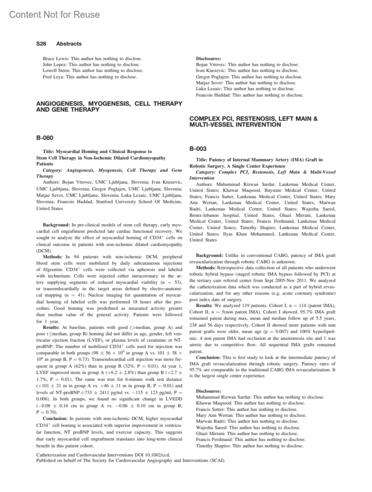 Catheterization & Cardiovascular Interventions 81:p S28-S29, May 2013.