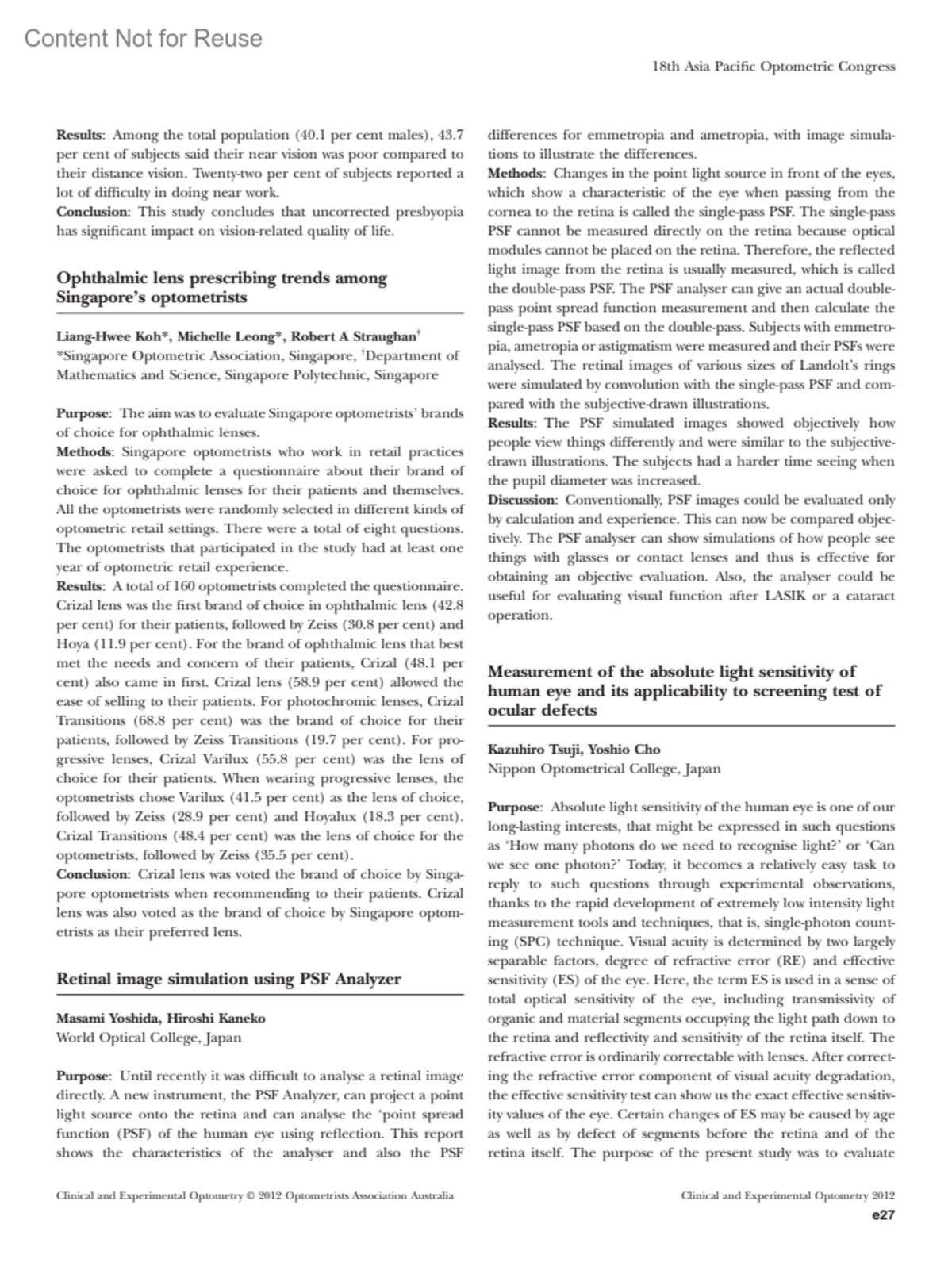 Measurement of the absolute light sensitivity of human eye and its applicability to screening test of ocular defectsTsuji, KazuhiroCho, YoshioAuthor informationNippon Optometrical College, JapanClinical and Experimental Optometry 95(4):p e27-e28, July 2012.Copyright © 2012 John Wiley & Sons, Inc.