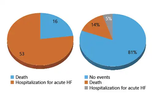 At the last follow-up (January 31, 2015), 69 clinical events were recorded: 53 hospitalizations for acute HF and 16 CV deaths; these events, which were considered as study endpoints, occurred in 19% of the overall population, as shown in Figure 2.