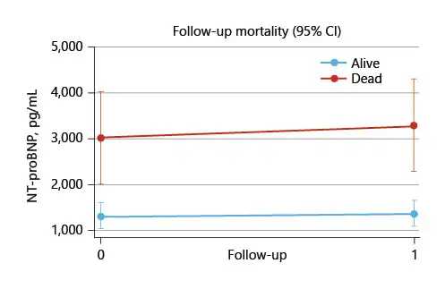 In our study, NT-proBNP represents a strong predictor of CV outcome: an increase in NT-proBNP of 500 units compared to baseline is anytime correlated to an increased relative risk of CV death, and it also influences the “transition” from the state of health to the state of illness/death; moreover, patients with serum levels > 1,250 pg/mL are at increased risk of hospitalization for acute HF. These associations persist considering also the composite of CV mortality and hospitalization.