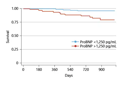 During the follow-up period, CV death was observed in 16 patients; there was no statistical correlation with gender (p = 0.088) and age (p = 0.1636); baseline serum levels of NT-proBNP, however, which were 3 times higher in deceased patients, were significantly related to this clinical event (p = 0.001) (Fig. 3). Kaplan-Meier analysis confirmed these data: it demonstrated, in particular, that concentrations of NT-proBNP > 1,250 pg/mL are predictors of reduced survival (p = 0.0003) (Fig. 4).