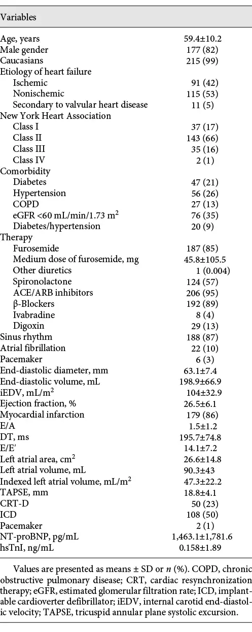 The baseline characteristics of the patients are summarized in Table 1; the mean age of the overall population was 59 ± 10 years, 82% were males, and 99% were Caucasians. Ischemic HFrEF patients (average EF 26.5%) was noted in 42%; 66% were in New York Heart Association (NYHA) functional class II. Among CV risk factors, hypertension and type II diabetes were present in 26 and 21% of the patients; respectively. Chronic kidney disease, classified according to the National Kidney Foundation [], was found in 35% of the patients.