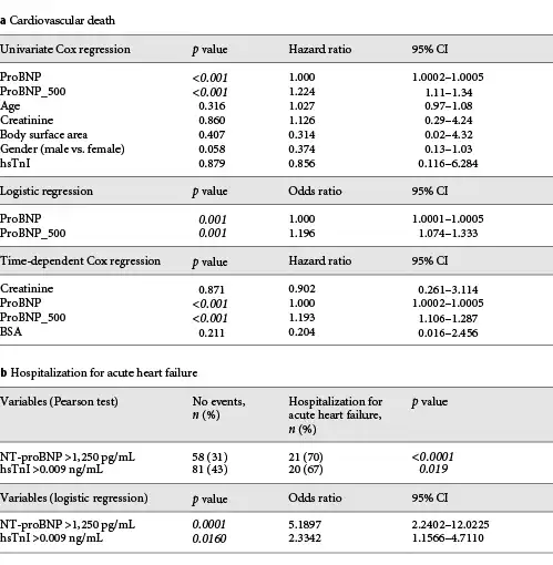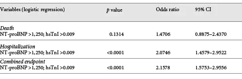 Regarding the secondary study endpoint (hospitalization for acute HF), it was pointed out that in hospitalized patients serum levels of NT-proBNP and hsTnI were higher than in patients with no hospital readmission (in particular: NT-proBNP > 1,250 pg/mL and hsTnI > 0.009 ng/mL); using regression analyses, we demonstrated a significant correlation between an increase in the risk of hospitalization and serum concentrations of both biomarkers (Table 2b).
