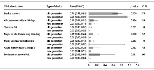 Compared to the old-generation THV devices, newer-generation THV devices (Evolut R, SAPIEN 3, Lotus Valve System, Direct Flow, ACURATE TA, JenaValve, and J-Valve) had a higher device success (95 vs. 71%, p = 0.000) and a lower incidence of moderate to severe AR (0 vs. 28%; p = 0.031) (Fig. 4). All-cause mortality at 30 days (7 vs. 12%; p = 0.484), stroke or TIA (0 vs. 2%; p = 0.291), major or life-threatening bleeding (1 vs. 11%; p = 0.080), major vascular complications (2 vs. 6%; p = 0.363), and acute kidney injury (5 vs. 10%; p = 0.467) occurred similarly in both the new- and old-generation groups.