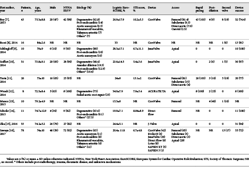 Data were gathered including first author, year and journal of publication, number of patients, and type of device. Patients’ characteristics such as age, sex, New York Heart Association functional class, left ventricular ejection fraction, logistic European System for Cardiac Operative Risk Evaluation score (logistic EuroSCORE), the Society of Thoracic Surgeons score (STS score), and the safety and efficacy outcomes according to Valve Academic Research Consortium 2 criteria were extracted.