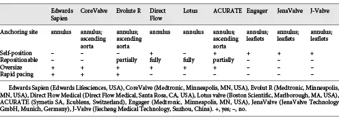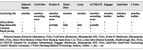 The present studies showed that the etiology of regurgitation was degenerative in the majority of patients but also included annular dilation, previous endocarditis, rheumatic disease, arteritis, or postradiation valve disease. Due to diverse etiologies, patients with AR have a more complex and variable anatomy. They often have a dilated aortic root, a dilated ascending aorta, and an elliptical annulus. Further, the lack of calcification of native aortic cusps and the large annular anatomy contribute to increase the risk of inadequate anchoring, prosthesis dislodgment, and residual paravalvular leak (PVL), so the complex and variable anatomy make transcatheter therapies more challenging. The features of the available THVs in TAVR for pure AR are reviewed in Table 2.