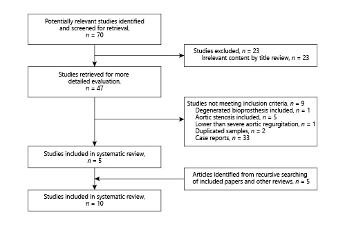 PubMed and Web of Science databases (2002–2016) were searched using the Boolean operators: (transcatheter aortic valve replacement OR transcatheter aortic valve implantation OR TAVR OR TAVI) AND (aortic regurgitation OR aortic insufficiency OR aortic valve regurgitation OR aortic valve insufficiency OR AR OR AI) from January 2002 to August 2016. The title, abstract, and keywords of the retrieved articles were examined for relevance. Papers were included if they considered an association between TAVR and pure AR. There were no restrictions on the year of publication or language. Full-text versions of all articles were obtained. Case reports and series including patients with failing bioprostheses or AR secondary to other conditions such as endocarditis or aortic dissection were excluded. Articles without any novel data were excluded, such as reviews and comments. Reference lists of all returned articles were searched recursively for other relevant citations.