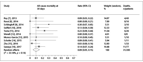 Continuous data are reported as mean ± SD and categorical variables as number of patients and percentage. Random effects meta-analysis was conducted using the Metaprop command, which allows computation of 95% confidence intervals (CIs) using the score statistic and the exact binomial method and incorporates the Freeman-Tukey double arcsine transformation of proportions. All analyses were performed with Stata statistical software version 12 (StataCorp LP, College Station, TX, USA).